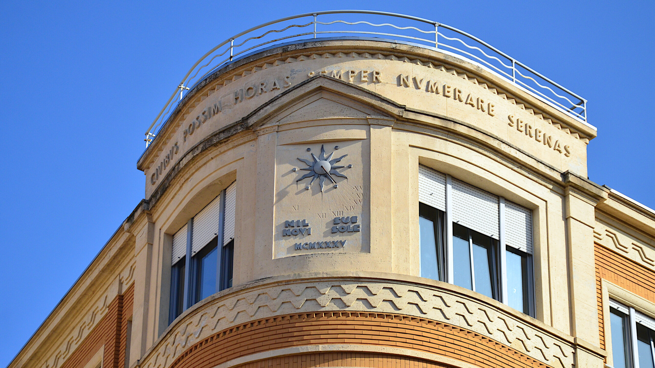 Zegar znajduje się na rogu kamienicy przy Piazza Roberto Raviola, między oknami najwyższego piętra. Jest pionowy, na tarczy znajduje się wizerunek słońca, a godziny są opisane cyframi rzymskimi. Powyżej zegara znajduje się napis: